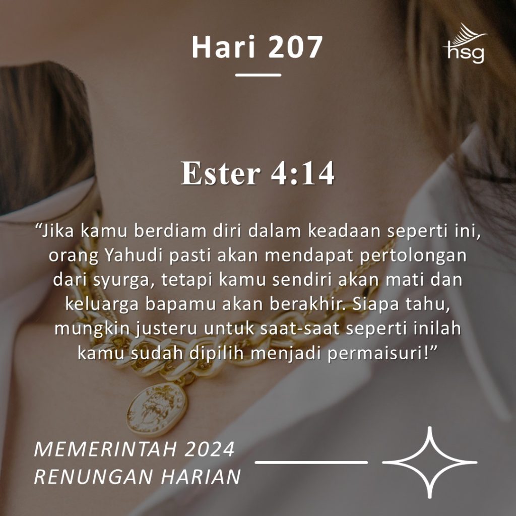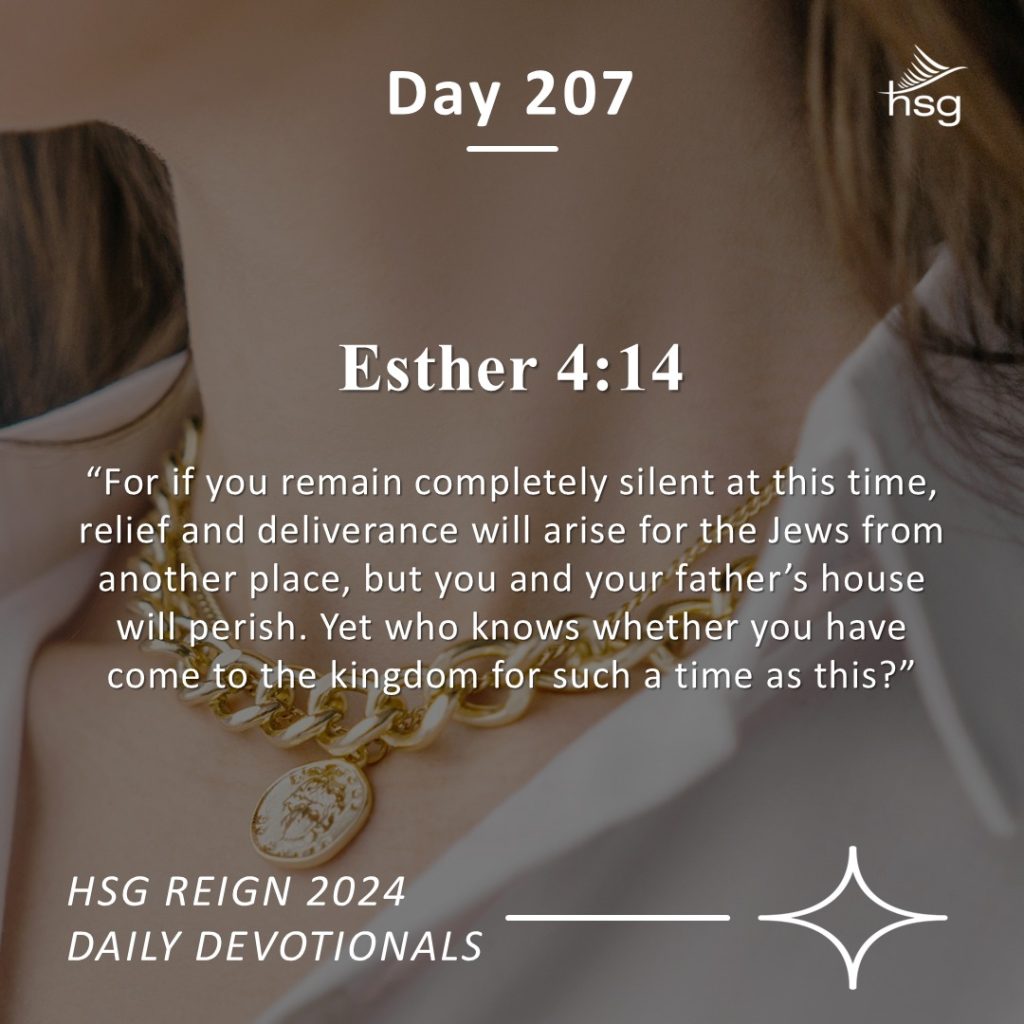 Kadangkala, Hidup ini menghadirkan detik dan peluang untuk mencapai detik yang mengubah kehidupan. Ayat ini menerangkan detik sedemikian untuk Ratu Ester. Di dalam Perjanjian Baru, Efesus 2:10 mengajar bahawa kita adalah buatan Tuhan yang dicipta untuk melakukan pekerjaan baik yang telah Dia tetapkan untuk kita! Tuhan telah merencanakan peluang dan detik dalam hidup untuk melakukan perubahan dan kita harus menemukannya. Jangan lepaskan peluang sedemikian hanya kerana takut, tidak percaya, ragu-ragu, takut gagal, atau malu. Seringkali, Tuhan akan membawa situasi seperti itu kepada anda dan anda harus melihatnya dengan perspektif Tuhan dan bukan perspektif anda sendiri, seperti yang berlaku kepada kebanyakan orang dan akhirnya terlepas peluang. Pada saat-saat seperti itu, percaya kedaulatan dan kasih karunia Tuhan yang akan melepaskan tangan-Nya untuk bekerja bagi anda.