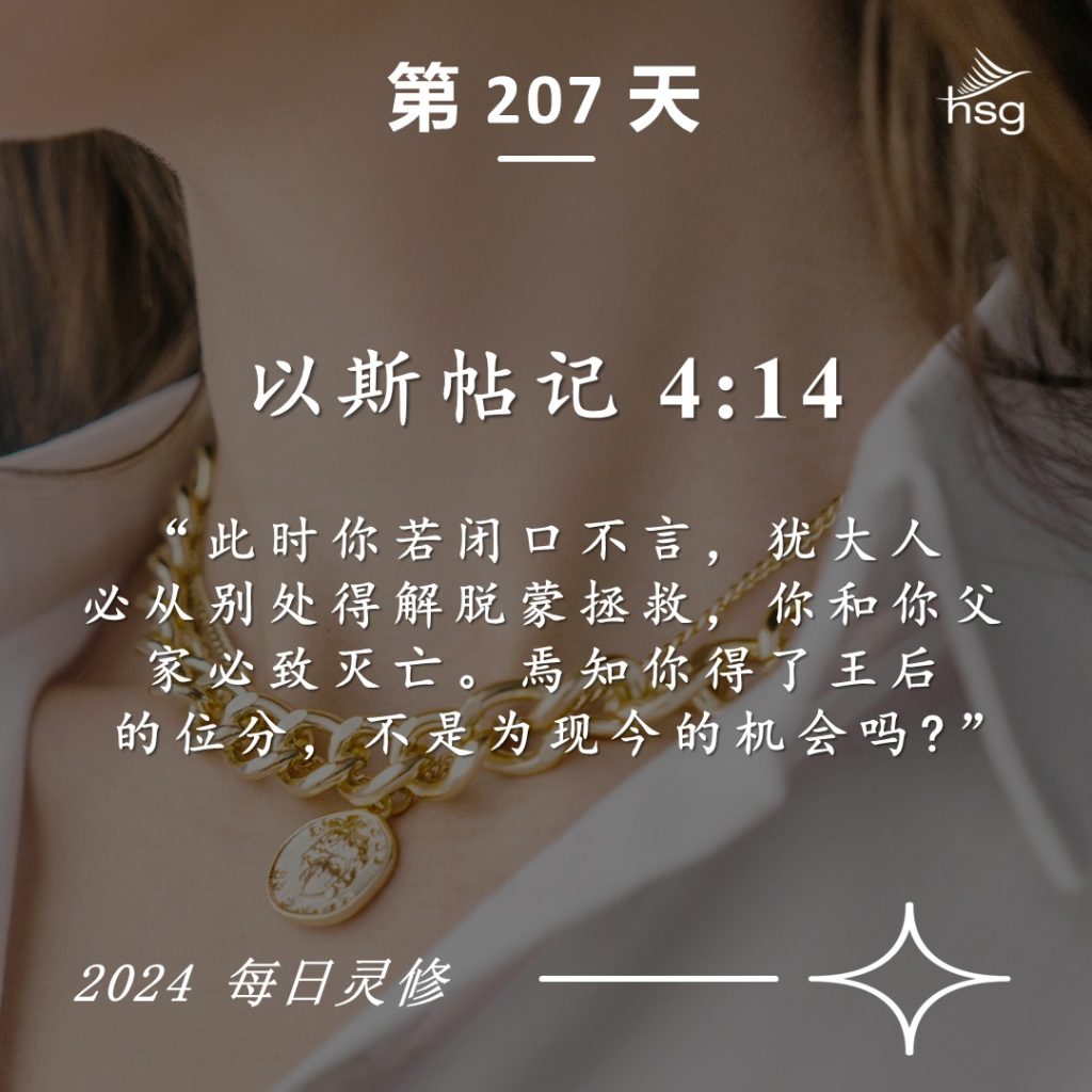 偶尔,生活会提供一个实现改变人生的时刻和机会。 这节经文描述了以斯帖王后的这样一个时刻。新约以弗所书 2:10 教导说,我们原 是上帝 的 工 作 , 为 要 叫 我 们 行 善 , 就 是 神 所 预 备 叫 我 们 行 的 。上帝预先计划了生命中的机会和时刻来改变现状,我们应该留意它们。不要因为恐惧、不信、自我怀疑、害怕失败或尴尬而错过这样的机会。每隔一段时间,上帝会把这样的情况带到你面前,你必须用上帝的角度而不是自己的角度来辨别它们,就像大多数人会做的那样,并且会错过它。在这样的时刻,相信上帝的主权和恩典将会发动上帝之恩手为你工作。