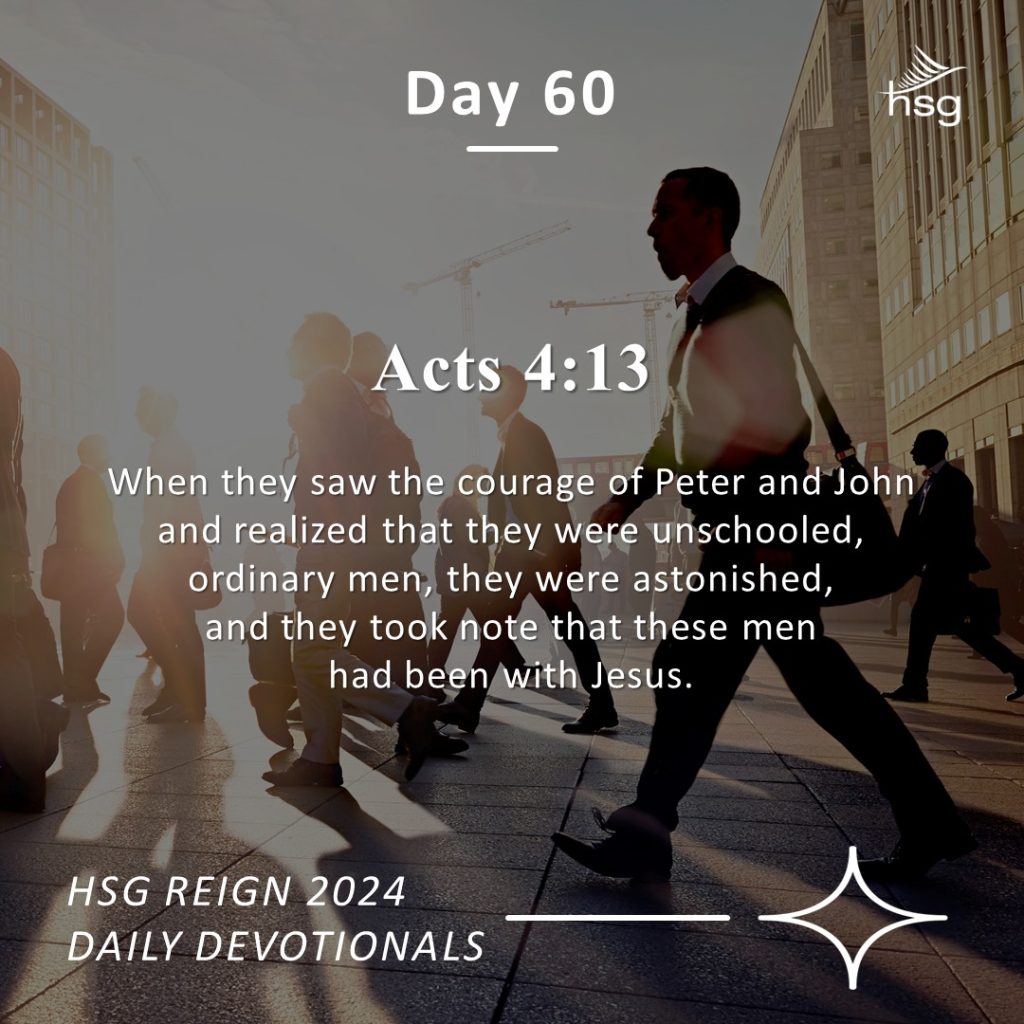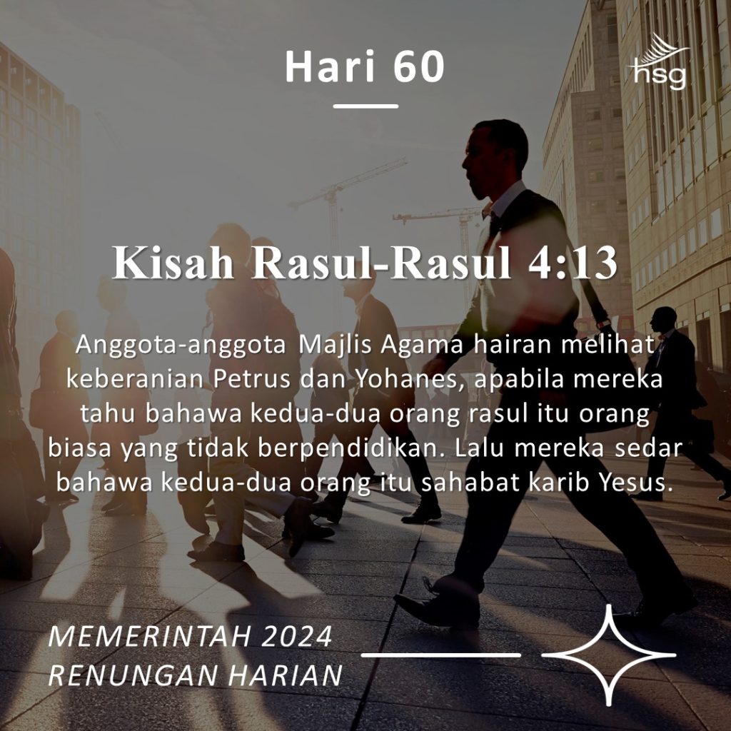 Apabila kita berjalan bersama Yesus, kita menjadi orang yang berbeza. Inilah yang berlaku kepada murid-murid yang pertama. Salah satu perubahan yang dramatik dalam diri mereka adalah keberanian dalam kesaksian mereka tentang Yesus. Ianya begitu menonjol sehingga orang ramai melihat keberanian mereka dan menyedari bahawa mereka telah bersama dengan Yesus. Keberanian dan semangat untuk bersaksi tentang Kristus merupakan petanda yang jelas tentang perjalanan seseorang dengan Yesus. Apabila Kristus menjadi nyata dalam kehidupan, sukar bagi sesiapapun untuk berdiam diri dan tidak berani bersaksi tentang Dia. Oleh itu, mereka yang sangat dekat dengan Kristus adalah yang paling berani manakala mereka yang jauh dari Kristus adalah yang paling senyap dalam bersaksi tentang Kristus! Keberanian dan semangat anda dalam bersaksi bagi Kristus adalah ukuran yang sangat baik dalam hubungan anda dengan Kristus.