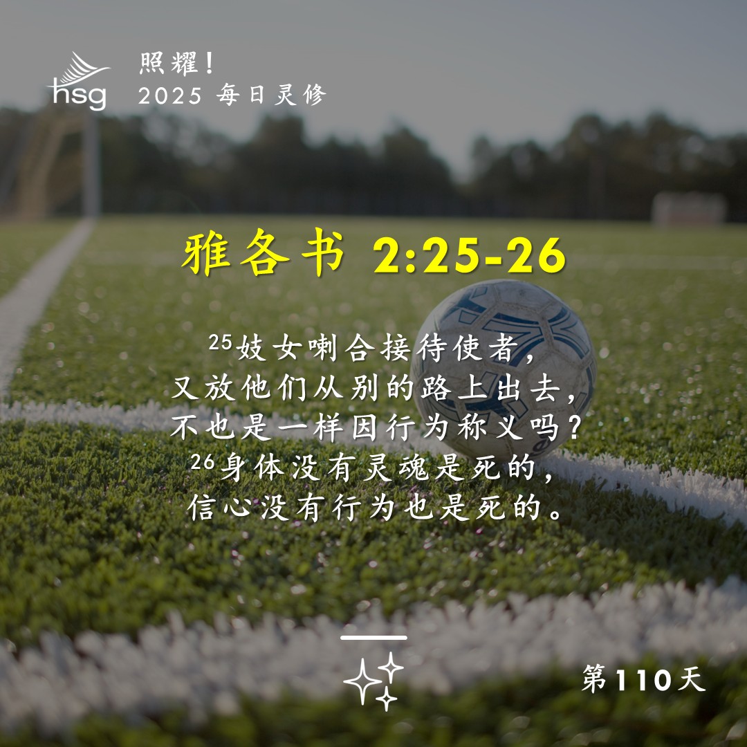 拥有信心而没有相应的顺服行动是死的。多么强烈的属灵状态预后啊! 信心和行为是密不可分的。信息圣经用了更令人震惊的话语:把信心和行为分开,你会得到一具尸体!对上帝的真正信心会导致积极主动,而不是被动。真正的信心为我们提供了奉耶稣之名采取主动行动的内在力量!