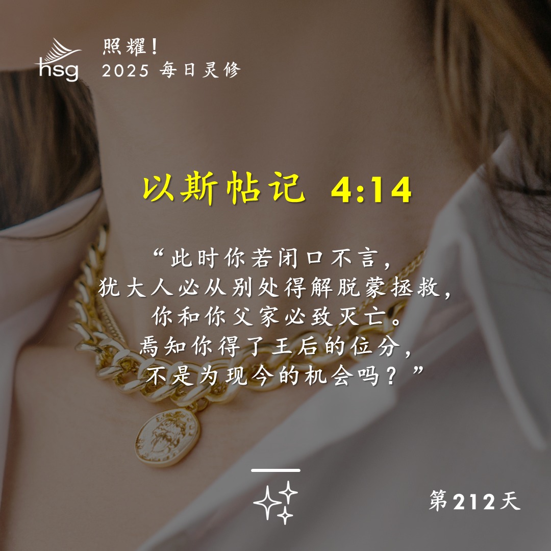 将自己视为上帝计划和目的的一部分,并“为这样的时刻”凭信心走出去!