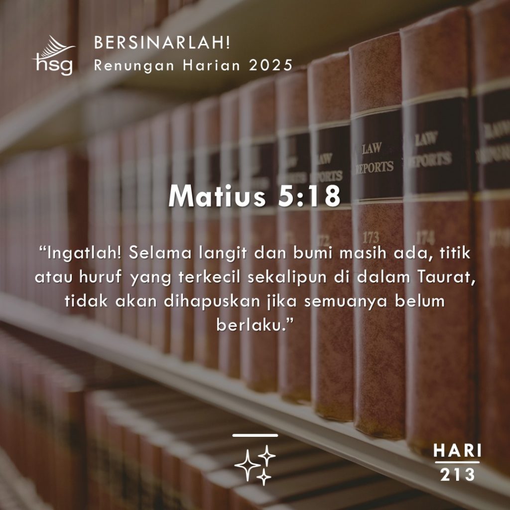 Yesus menegaskan bahawa walau sebahagian kecil daripada Hukum Tuhan tidak akan hilang sehingga semuanya digenapi. Dia memanggil kita kepada kebenaran yang melampaui peraturan semata-mata. Ini bukan tentang ketaatan legalistik, tetapi tentang hati hukum: kasih, belas kasihan, dan keadilan. Kesalehan sejati mengalir dari mengetahui Firman dan mencerminkan karakter-Nya, bukan kesesuaian lahiriah. Ketaatan radikal ini mencabar norma mementingkan diri sendiri, memberi inspirasi kepada kita untuk mempertahankan kebenaran, dan mengubah masyarakat.