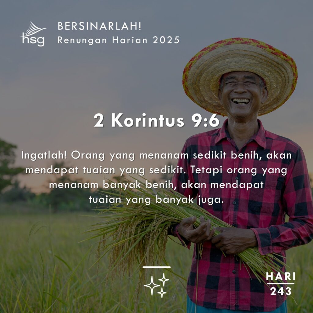 Sebagaimana hasil tuaian seorang petani berdasarkan benih yang dia tabur, demikian tuaian rohani kita adalah hasil daripada tindakan kita. Matius 5:14-15 mengatakan bahawa kita adalah terang dunia dan kota yang terletak di atas bukit tidak mungkin tersembunyi. Kita harus meletakkan pelita kita di atas kaki dian, supaya menerangi semua orang di dalam rumah. Merenungkan Firman Tuhan ini mendorong kita untuk bertanya: Adakah kita terang yang melipatgandakan terang? Adakah kita menabur dan memancarkan terang kita dengan murah hati, sehingga kita menuai terang dengan berlimpah-limpah dan menjadi sebuah kota di atas bukit yang tidak dapat disembunyikan? Atau adakah kita menabur secara berjimat dan akhirnya menyembunyikan terang kita di bawah mangkuk?