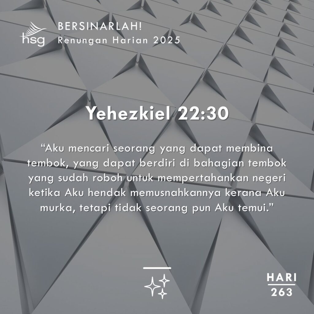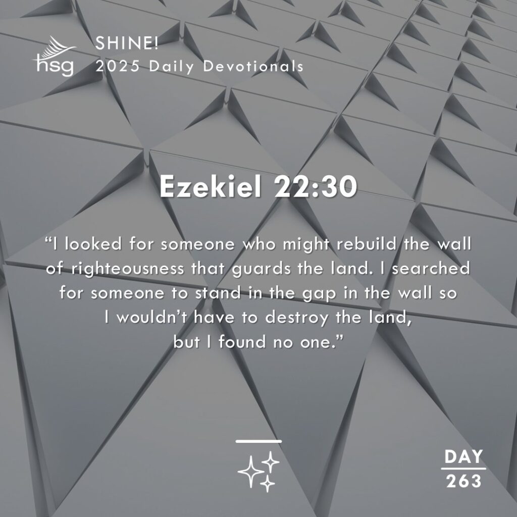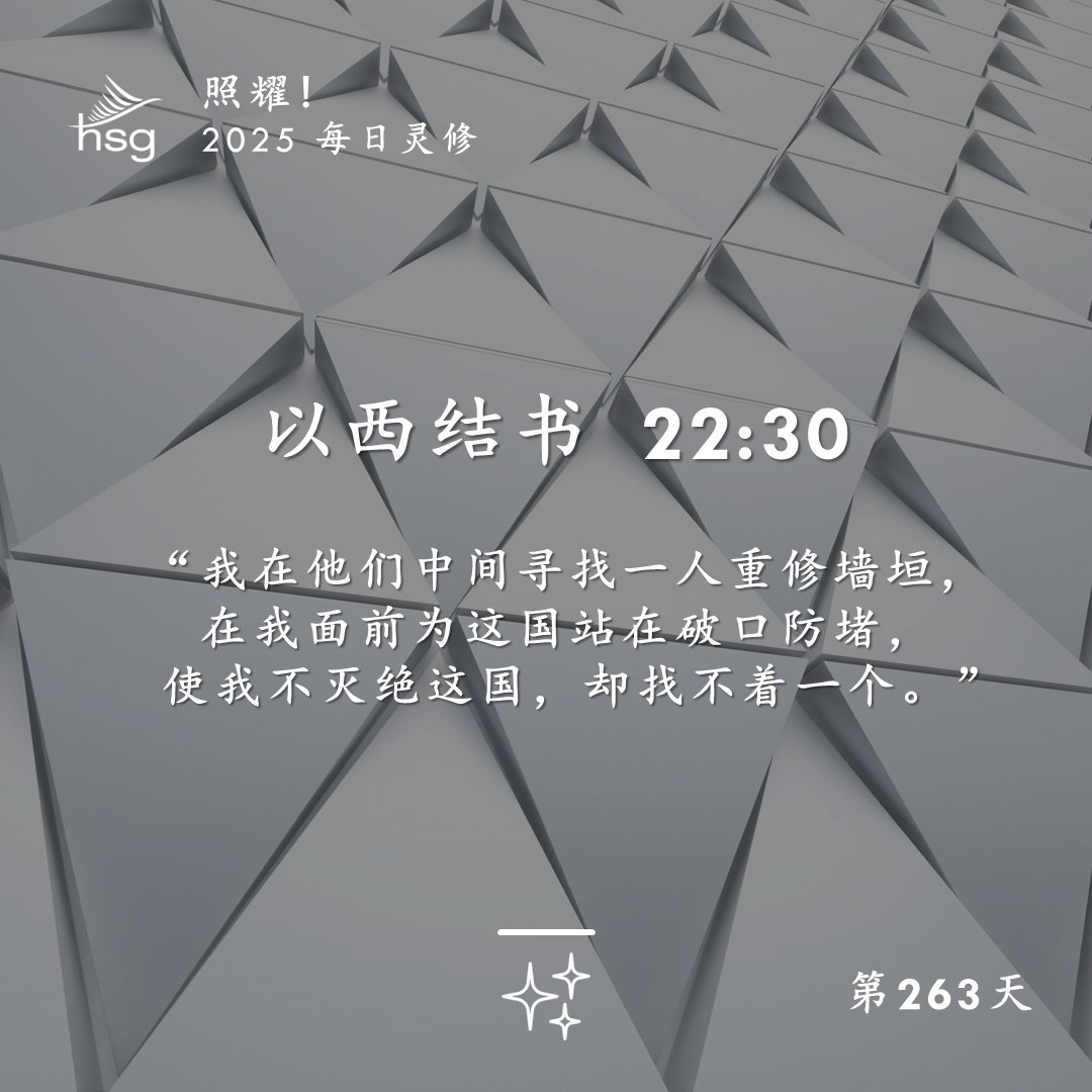 这节经文中最大的悲剧在于,如果上帝能找到一个人来代祷并站 在 破 口 防 堵,就不会灭绝这国。在我们的背景下,如果我们在那里,我们会是那个人吗?或许这不仅仅是缺乏同理心或同情心,而是对自己身份的认知不清晰。的确,单靠我们自己,我们永远都不够好。但我们需要明白,尽管我们不完美,上帝仍然可以使用我们。不是靠我们自己的力量或公义,而是靠的恩典和力量。我们只需要对祂说“是”,并让祂塑造我们生活的各个方面;成为祂改变的容器。
