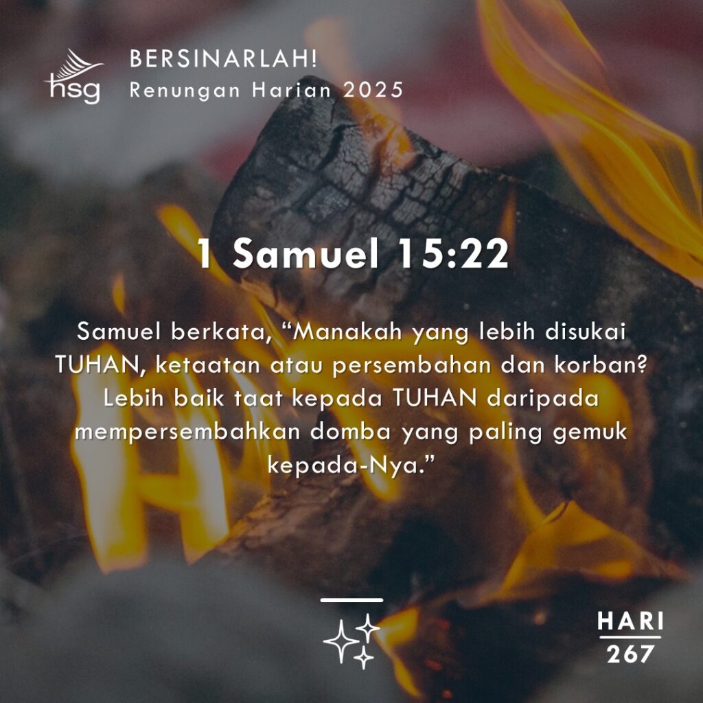 Saul menyangka bahawa dengan mempersembahkan korban dapat menutupi sebahagian ketaatannya, tetapi Tuhan lebih peduli kepada hati yang berserah daripada ritual luaran. Aktiviti keagamaan, nilai pemberian korban, atau pelayanan yang mengagumkan tidak ada maknanya jika kita mengabaikan suara-Nya.