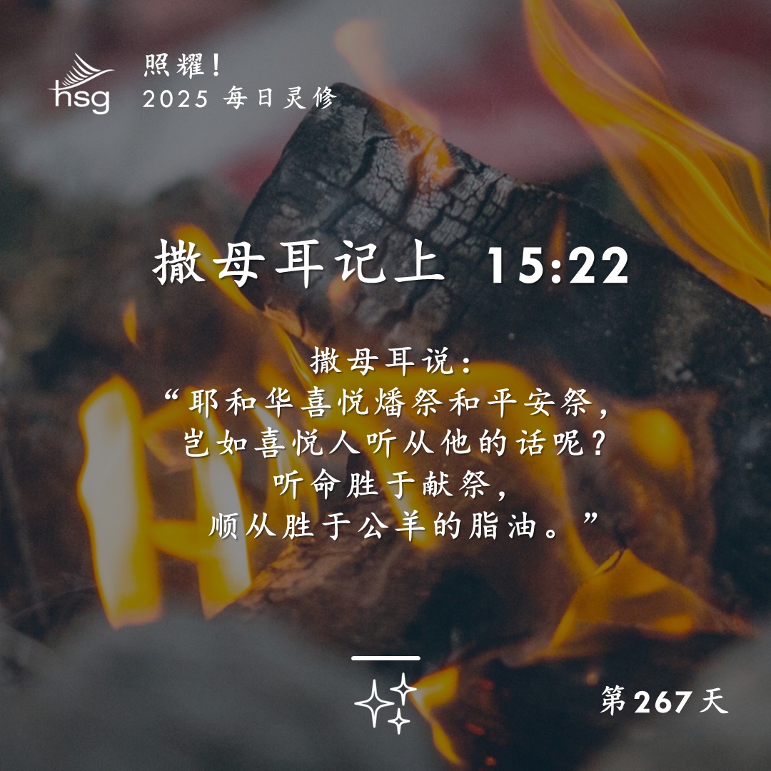扫罗认为献祭可以掩盖他部分的顺服,但上帝更关心顺服的心,而不是外在的仪式。如果我们忽视祂的声音,宗教活动、被认为是牺牲的奉献或令人印象深刻的服务就毫无意义。