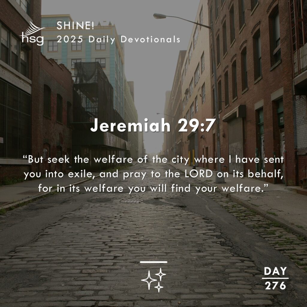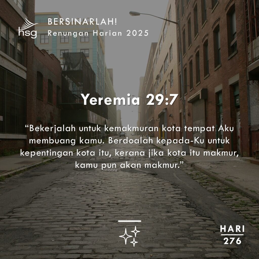 Ayat ini, yang ditulis bagi orang dalam pembuangan, membawa mandat yang kuat untuk kita sebagai sebuah gereja di kota, untuk kota, dan dari kota. Panggilan kita bukan menunggu perubahan secara pasif untuk kota, tetapi untuk secara aktif mengejar “kesejahteraannya” (Bahasa Ibrani: Shalom; bermaksud keamanan, kemakmuran, kesempurnaan). Kita melabur bagi kesejahteraan kota kita apabila kita melayani komuniti dan berdoa untuk pihak berkuasa. Apabila kota berkembang maju dari segi ekonomi, sosial, dan rohani maka Gereja juga memiliki persekitaran untuk berkembang maju.