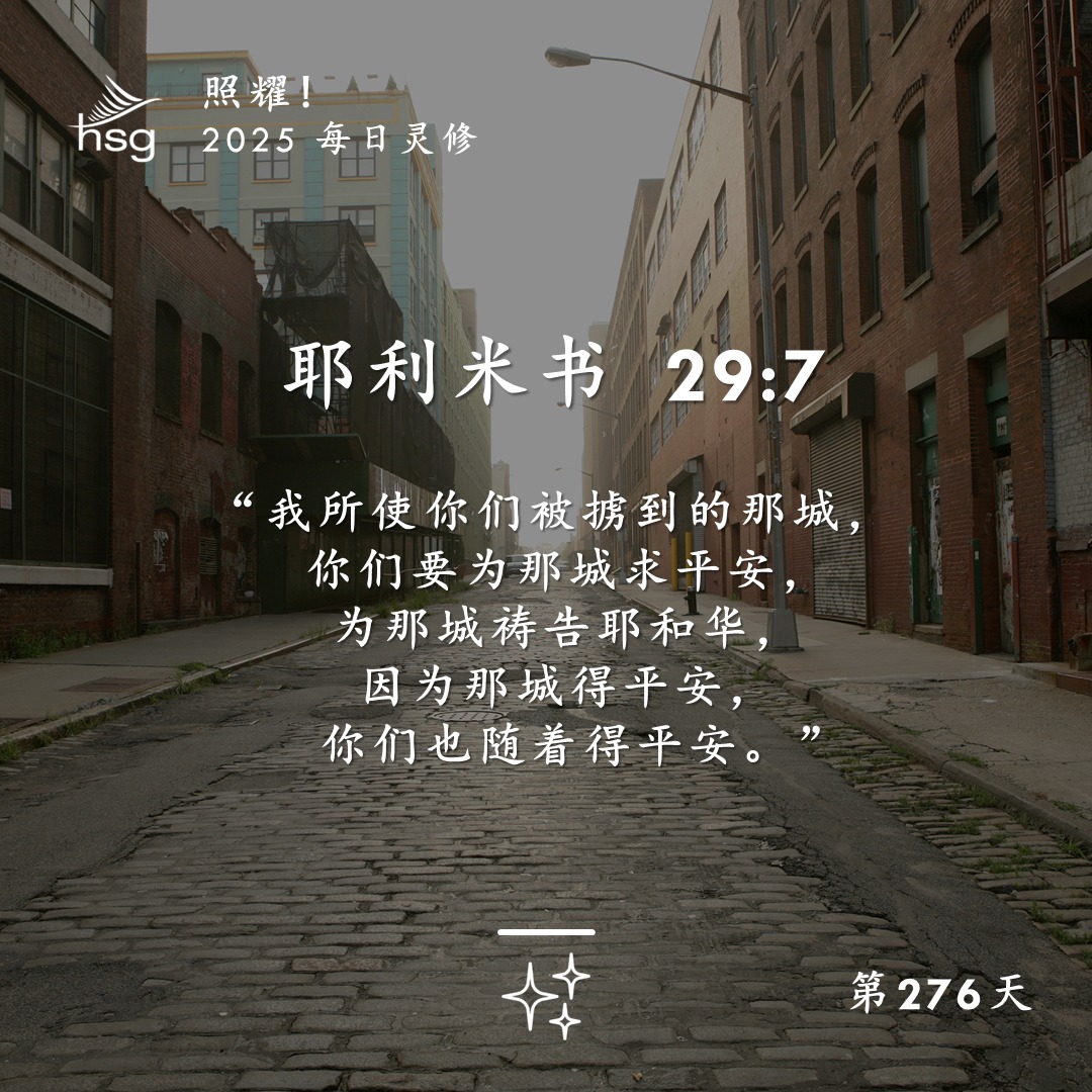这节经文是写给被掳之民的,却同时向我们这些 “在城市里的教会、为城市而立的教会、从城而出的教会” 发出强而有力的使命呼召。我们的呼召,不是被动地等待城市改变,而是要积极追求城市的 “平安” (希伯来文 shalom,意指平安、昌盛、完全)。当我们以行动服事社区、为执政掌权者代祷时,我们就在为城市的福祉投资。当城市在经济、社会、属灵各方面兴盛时,教会也就拥有一个茁壮成长的环境。